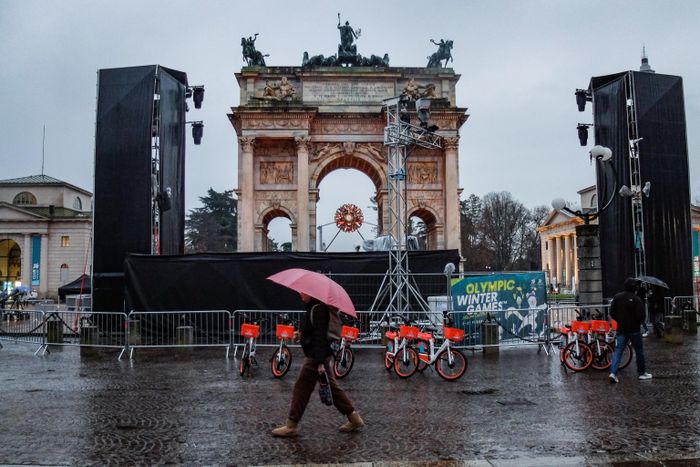 Arbeidere jobbet for fullt onsdag, sentralt i Milano, for å klargjøre til fredagens åpningsseremoni av OL 2026. Foto: EPA/Matteo Corner