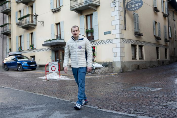Miha Hrobat sin tur her. Alle hans ski har blitt ødelagt, så han låner ski i dag.