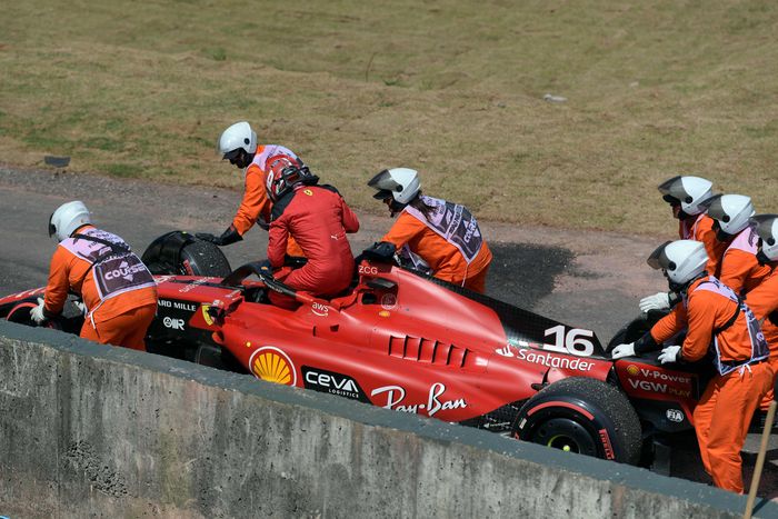 Funksjonærene hjelper Charles Leclerc med å få unna bilen. Foto: AFP