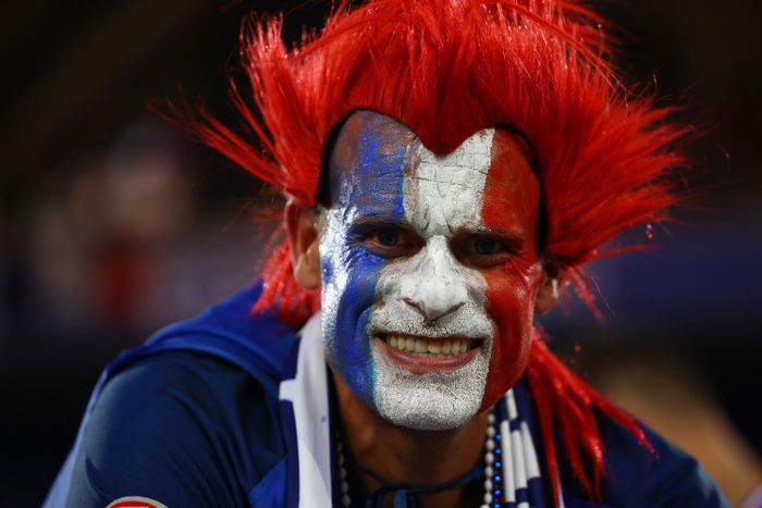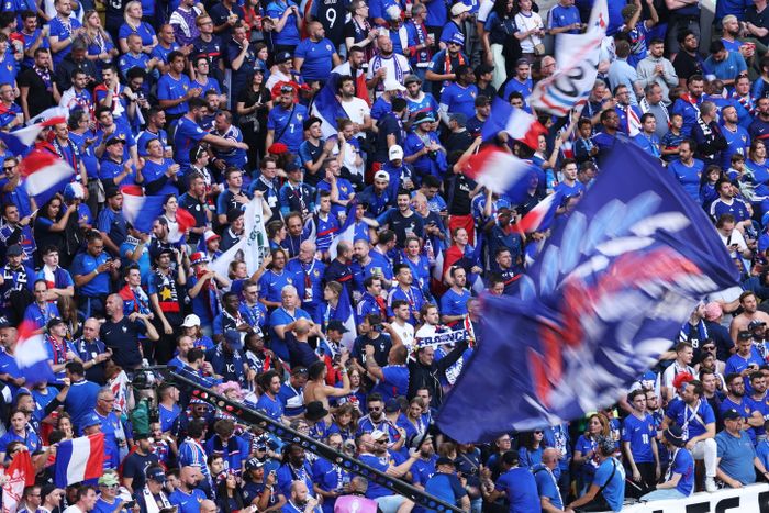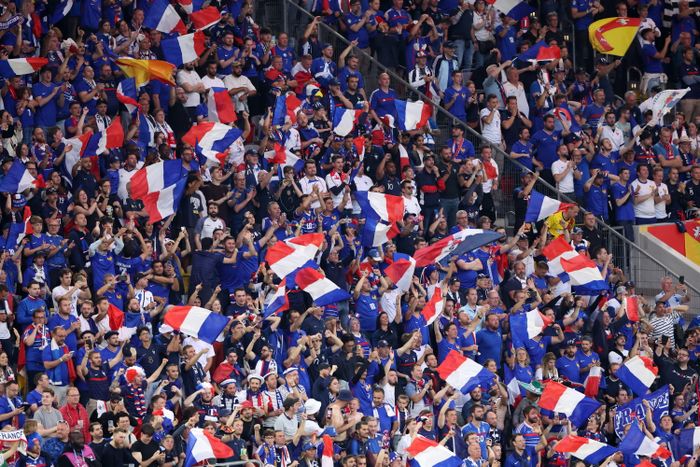 Frankrike har også en solid tilhengergjeng på plass i Düsseldorf, der det er plass til 40.000 tilskuere. Foto: EPA