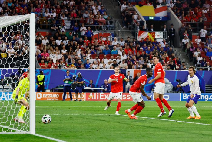 Griezmann legger inn, men et østerriksk hode får headet vekk ballen.