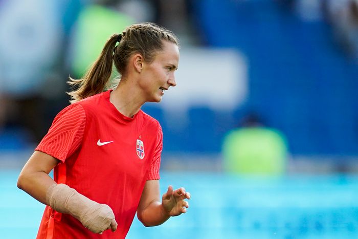 Caroline Graham Hansen spiller med et brudd i fingeren i dagens kamp. Hun pådro seg bruddet under gårsdagens trening. - Hun har fått medisinsk oppfølging og er iført en lett skinne/beskyttelse som gjør at hun er klar for kamp, sier landslagslege Said Tutunchian. Foto: Terje Pedersen, NTB