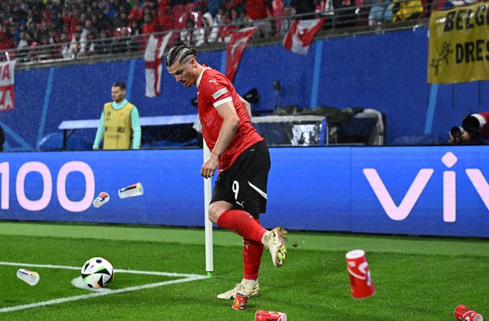 Baumgartner setter fart fremover sentralt. Kokcu feller ham, og Østerrike får frispark i god posisjon.