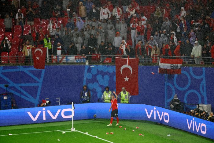 Tyrkiske fansen prøver å sette Sabitzer ut av spill når han skal slå cornerne.