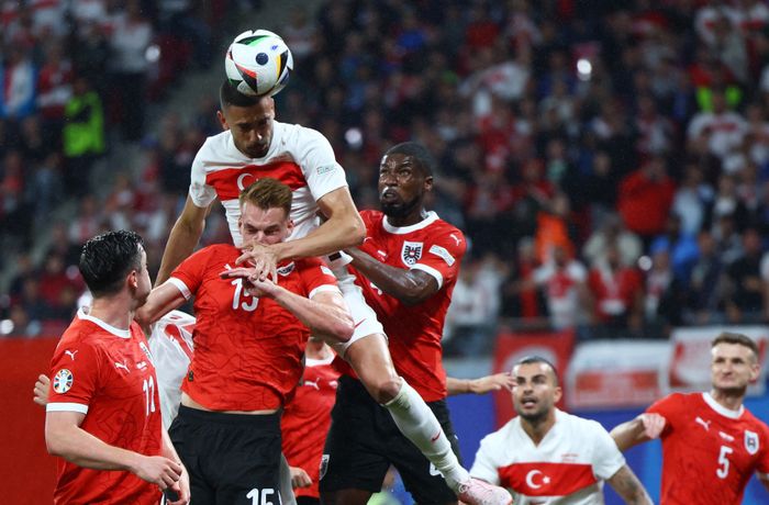 Lang ball opp mot Yilmaz. Er i ubalanse i det han mottar ballen. Østerrike overtar.