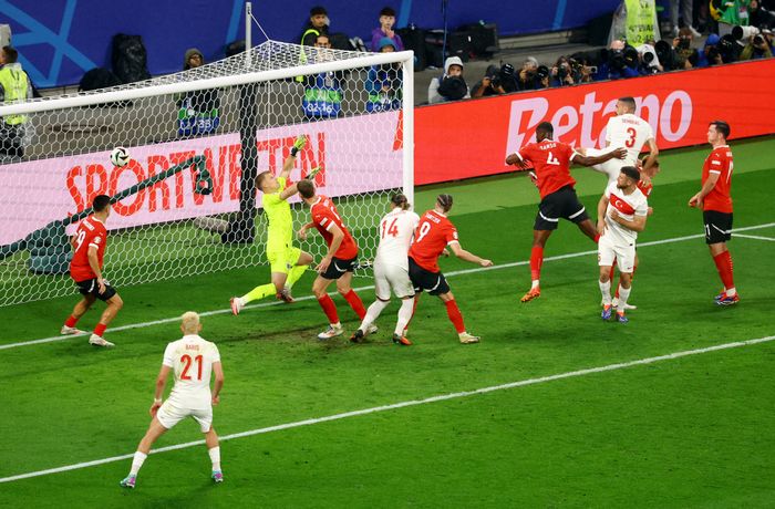 Gunok sjanser med en boksing. Demiral har tilsynelatende full kontroll, men keeperen satser likevel og går ut. Få centimetere om å gjøre at den traff hodet til Baumgartner, som da ville hatt blank kasse.