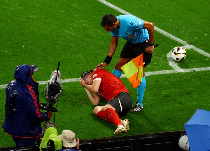 Utenfor bildet har Sabitzer blitt truffet av en gjenstand, opplyser NRKs Carl-Erik Torp.