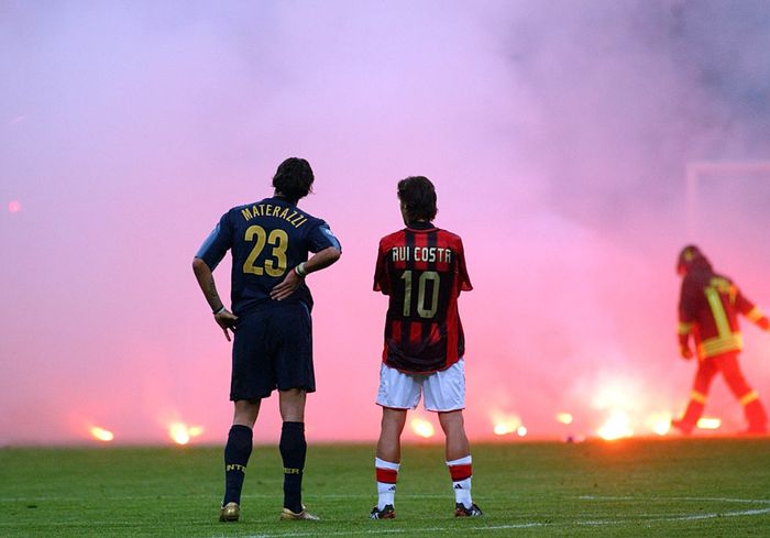 Sist gang de to Milano-lagene møttes til dyst i Champions League var tilbake i 2005. Den gangen ble nødbluss og andre gjenstander kastet ned fra Inter-fansen på tribunen. Det skadet den gangen stjernekeeper Dida i Milan-målet. En fotograf foreviget det som skjedde nede på gressmatta. En slags forbrødring mellom fiender på banen. Inters Marco Materazzi la nemlig albuen på skulderen til Milans Rui Costa midt i all dramatikken.