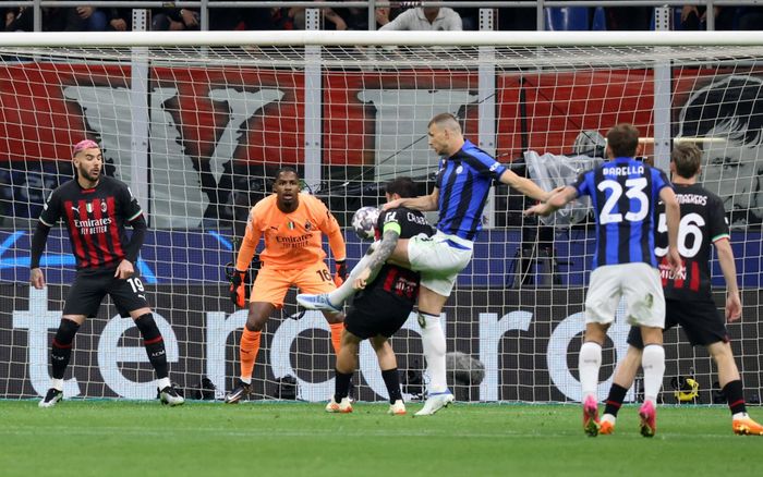 Edin Dzeko tar ballen lekkert ned, men Tomori er nede og sklitakler. Dzeko går i bakken og får frispark.