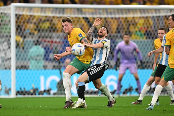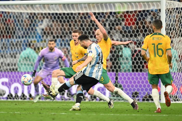 Lionel Messi dribler altså gjennom halve Australia-laget. Kommer seg nesten til en god avslutningsposisjon, men det blir «bare» corner. Men det skaper han helt på egen hånd. Foto: Bjørn S. Delebekk / VG