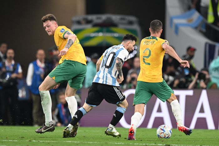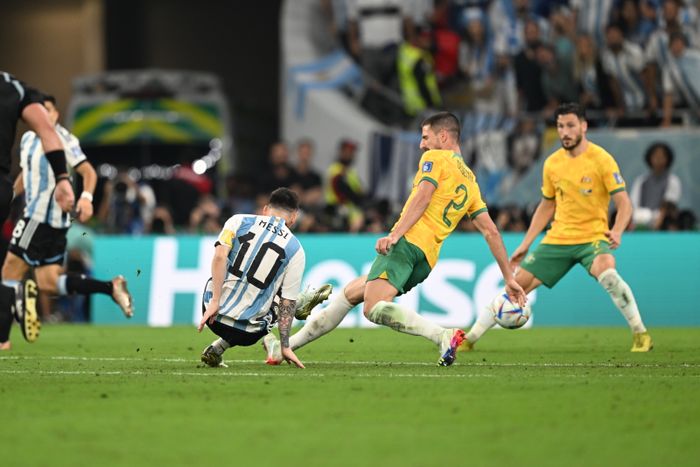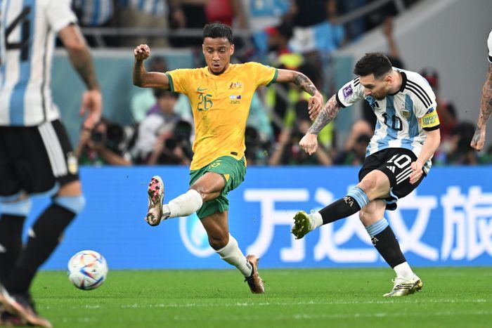 KANONADE FRA ARGENTINA! Martinez avslutter via et Australia-ben, som Ryan gir retur på. Returen kommer litt brått på for Messi. PSG-stjernen rekker ikke stokke beina, og han får dermed ikke avsluttet.