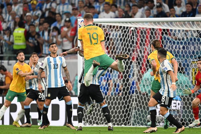 Fin mulighet for Australia! Souttar vinner luftduellen mot den vesentlig lavere Otamendi, men får ikke til en skikkelig heading mot mål. Foto: Bjørn S. Delebekk / VG