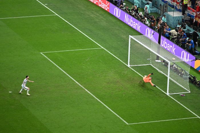 God Messi-mulighet! Godt veggspill med Enzo Fernandes sørger for at Messi kommer i en god posisjon til å sette inn 3-0. Men en kombinasjon av ubalanse, noe skrått hold og god målvakt hindrer 3-0. Foto: Bjørn S. Delebekk / VG.