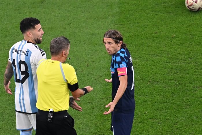 Modric rundlurer to argentinere før han legges i bakken av Alvarez og får frispark på egen halvdel.