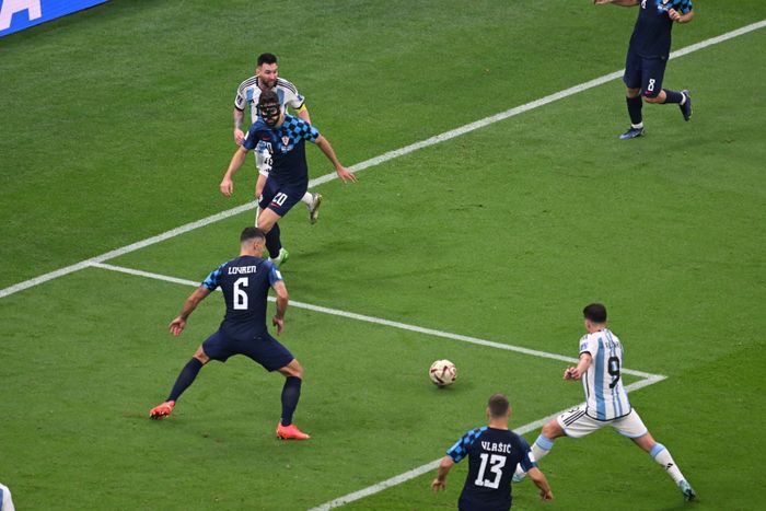SPIKEREN I KISTA, VEL?! Messi rundlurer Gvardiol flere ganger. Tar med seg ballen og Gvardiol på slep fra midtbanen. Feilvendt rykker han vekk fra Gvardiol like ved dødlinja, og så legger han dermed ballen ut til Alvarez som enkelt kan sette inn 3-0 fra kloss hold. FOR EN PRESTASJON AV MESSI! Foto: Bjørn S. Delebekk / VG.