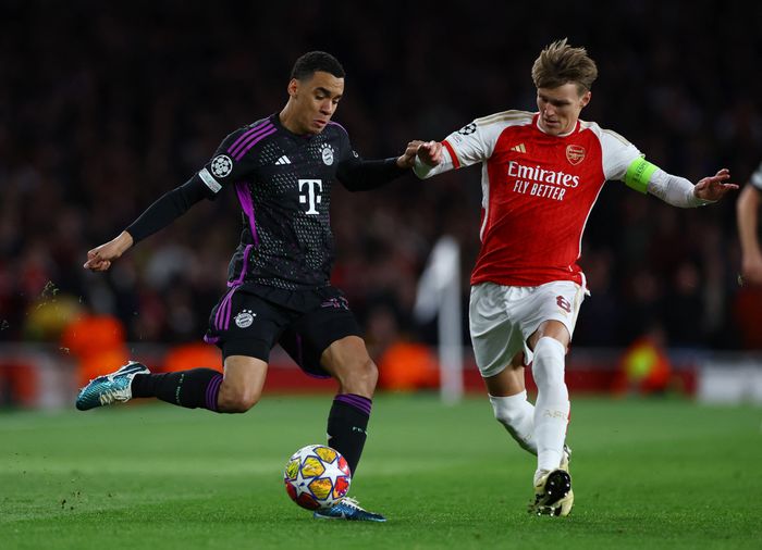 Ødegaard presser høyt - Bayern får innkast. Foto: Matthew Childs/Reuters