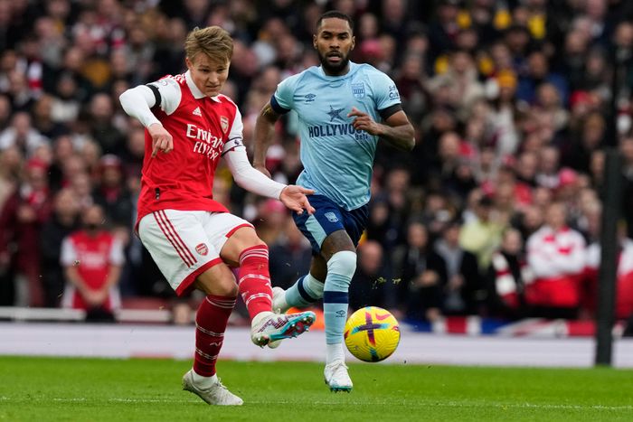 Ødegaard finter og danser seg frem til et innlegg fra høyre. Brentford får avklart.