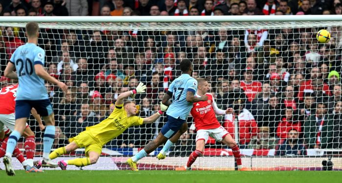 Nketiah får vendt opp på 16 meter, men en liten misforståelse. Utspill fra David Raya.