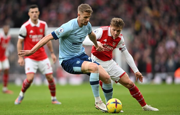Ajer med ballen blir hardt presset av Ødegaard. Ender med Brentford-innkast.