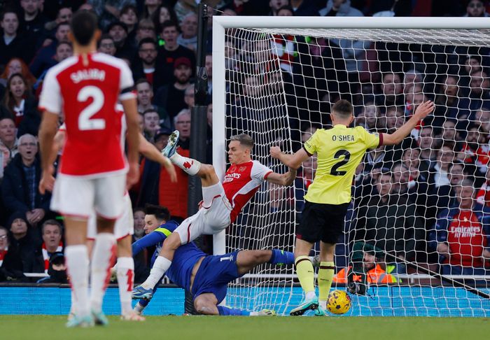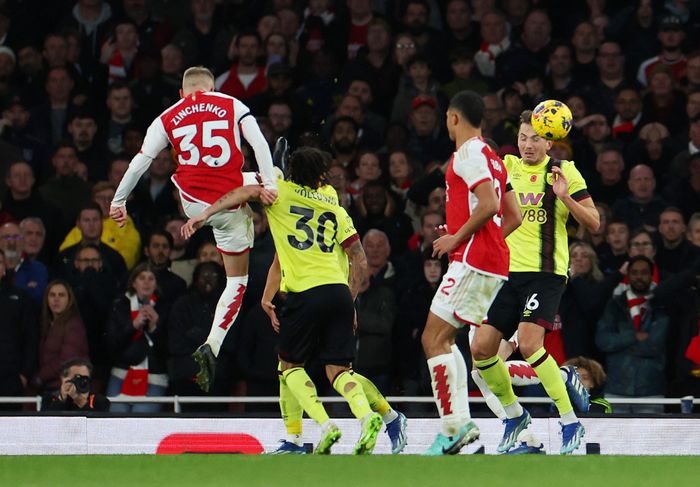 ZINCHENKO SAKSESPARKER INN NUMMER TRE! Først dunker ballen i tverrliggeren når ballen treffer Dara O'Shea i hodet. Så forsøker samme mann å stusse ballen ut av farlig område, men ballen lander rett i beina på Zinchenko som går for en akrobatisk variant og sender ballen i krysset.
