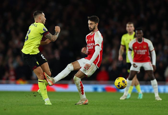 Går for en lang variant, Burnley, mot Koleosho. Han klarer ikke å drible seg forbi en meget god Tomiyasu.