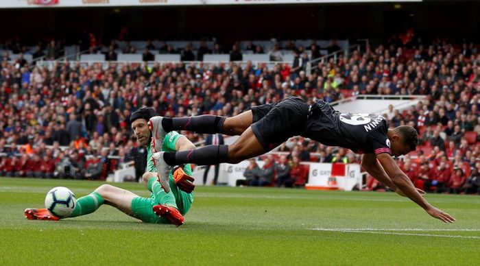 KJEMPEMULIGHET! Plutselig er Calvert-Lewin alene gjennom! Han stormer mot Cech og prøver å runde den rutinerte målvakten, som ikke lar seg lure. Stopper Calvert-Lewin og redder Arsenal fra en marerittstart! Foto: AFP.