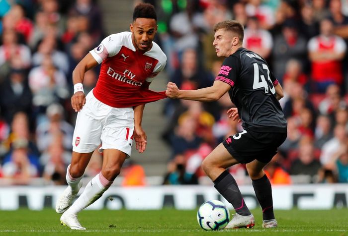 Aubameyang er jo et skikkelig hurtigtog. Ikke bare-bare å stoppe ham når han setter fart, noe Jonjoe Kenny også fikk erfare tidligere i denne kampen. Foto: Reuters.