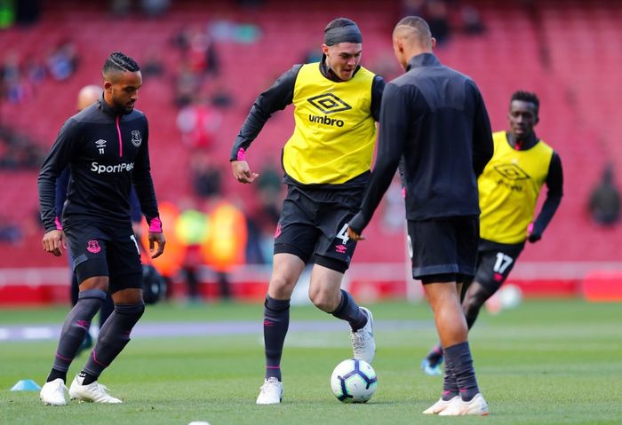 Gledelig for Everton at Michael Keane er tilbake, etter at han har vært ute i noen uker med en hodeskade. Bandasjen er på plass, når han her varmer opp med Theo Walcott, Richarlison og Idrissa Gueye. Foto: Reuters.