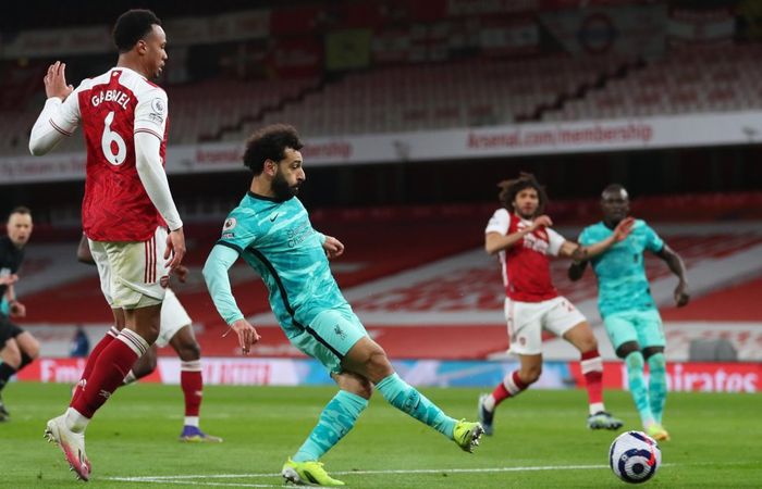 Salah er sterk i duellen med Gabriel. Får tatt ned, og holder ballen i laget.