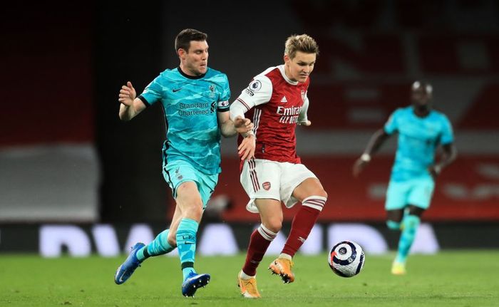 Ødegaard kjemper på midten, men taper i en tett duell med Fabinho. Ikke kommet skikkelig i gang Norges kaptein.