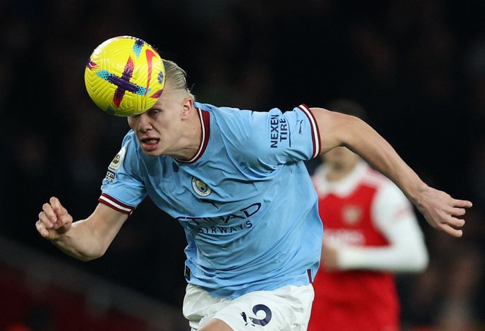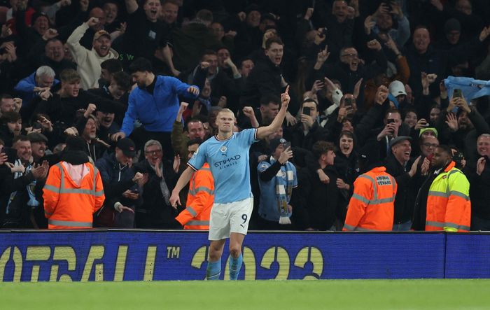 Haaland fosser framover, og er noe heldig når han får med seg kula i duell med Zinchenko og Gabriel. Spiller videre til Mahrez, men vingens lave innlegg ryddes unna. Foto: Reuters