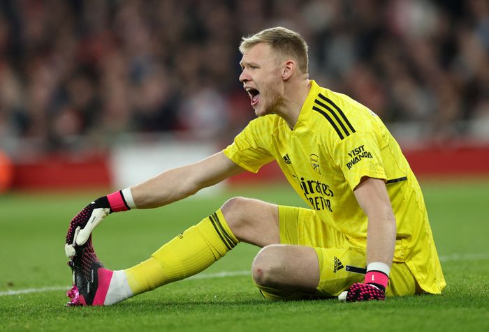 Ramsdale setter seg ned, men er oppe på beina igjen. Foto: Reuters
