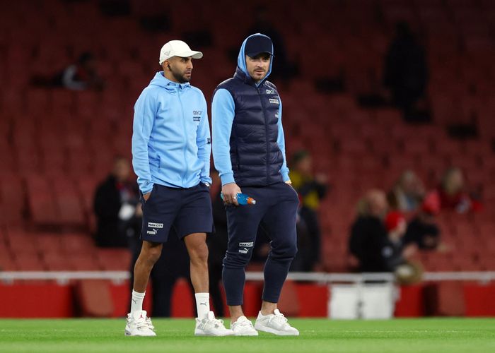 Jack Grealish og Riyad Mahrez sjekker gresset på Emirates stadium før kamp onsdag kveld. Dette er virkelig lillelørdag!! Foto: Reuters