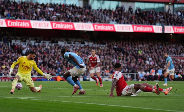 Arsenal slår langt mot Gyökeres, men City vinner ballen. Savinho felles på vei fremover, og da ser det ut til å gå mot poengdeling her.