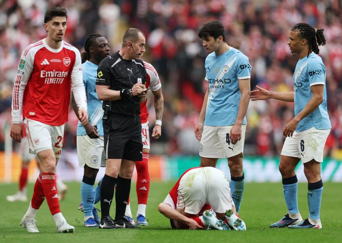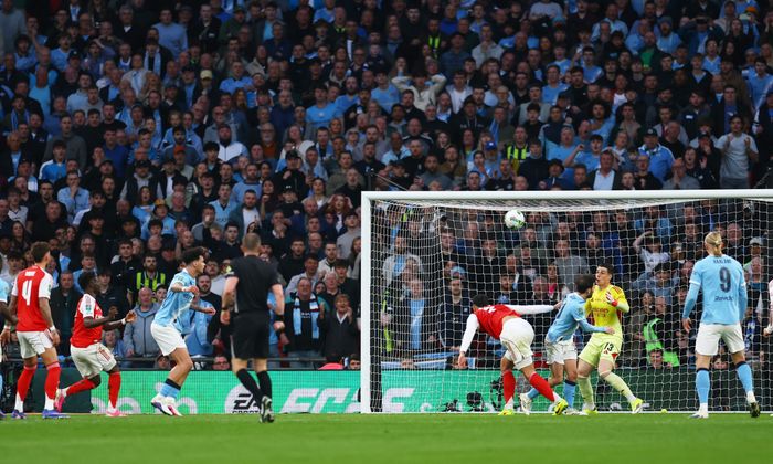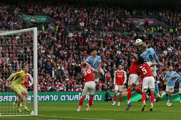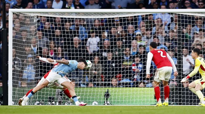 Arsenal vinner nesten ballen høyt, men Rodri klarer å holde unna. Småskummelt.