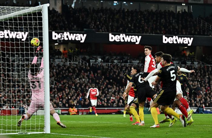 Arsenal roper på hands etter at Maguire kaster seg ned og blokkerer et skudd! Dommeren lar spillet gå videre.