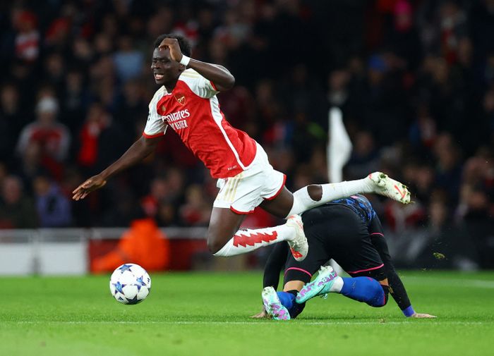 Saka får seg en luftetur av Gudelj. Foto: Reuters