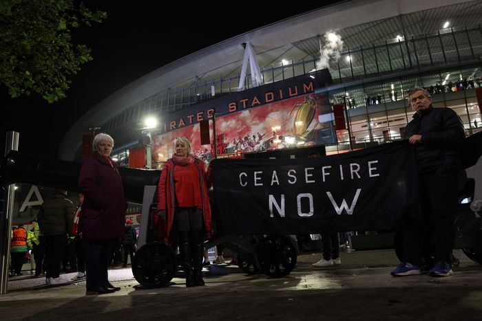 Demonstranter utenfor stadion krever våpenhvile. Foto: AFP