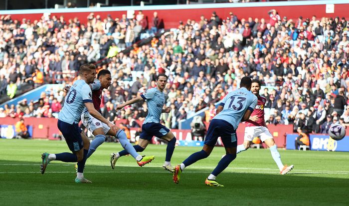 Villa går opp i ledelsen. McGinn slår nydelig inn. Watkins header på mål, men Flekken får dyttet den i stolpen. På returen står Bailey og pirker den i mål fra kloss hold. Mållinjeteknologien viser at ballen er inne fra Watkins' heading først. Foto: Craig Brough/Reuters