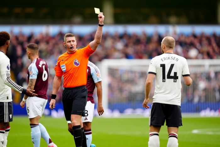 Dalot stopper Rogers i det han forserer fremover på høyrekanten sin. Ser ut som at han blir truffet med knottene og hjemmefansen vil ha frispark, men Jones vinker spillet videre.