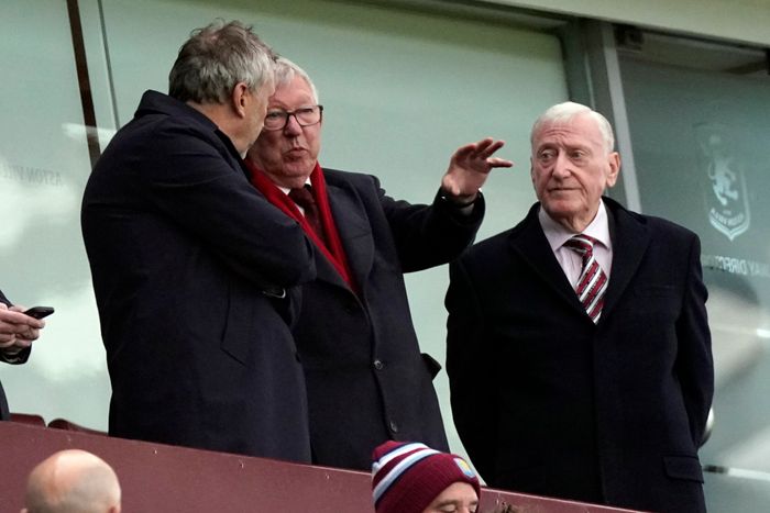 Sir Alex Ferguson sitter på tribuna og rynker på nesa.