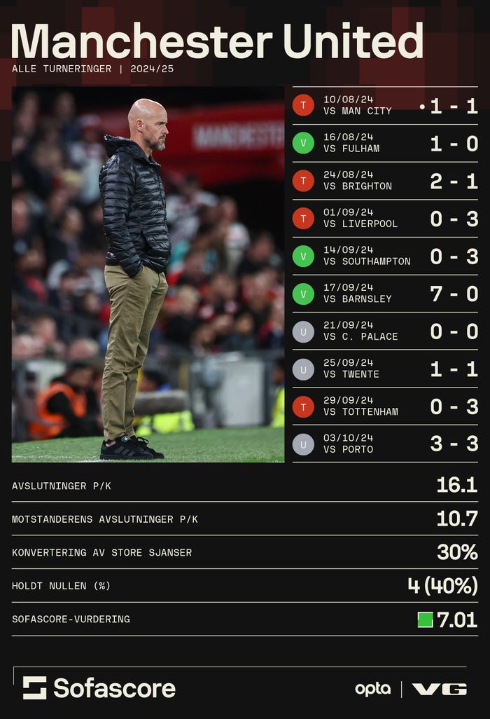 Fikk du ikke med deg hele kampen? Les alt om kampen og ten Hags krisestart her: https://www.vg.no/sport/i/8qEgm1/united-med-aatte-poeng-paa-syv-kamper-verste-paa-35-aar