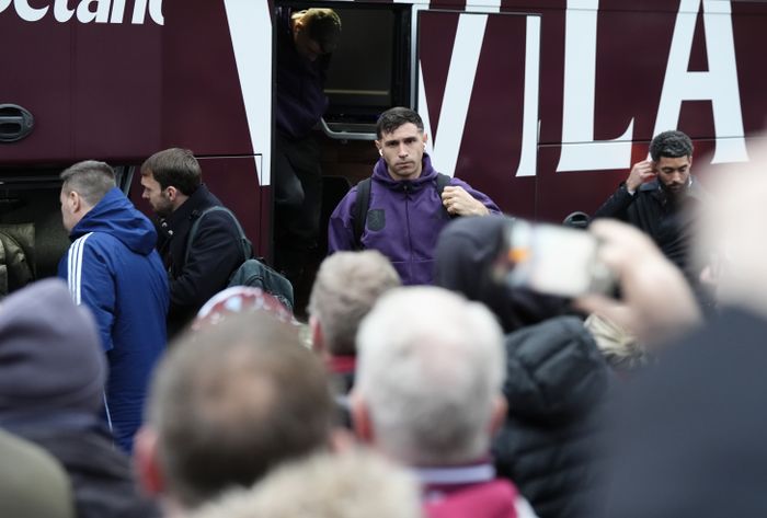 Aston Villa gjør en endring i laget siden forrige kamp, da de slo West Ham 3-2. Emiliano Martinez er tilbake i mål etter ryggtrøbbel, han erstatter Marco Bizot. Her er Martinez på vei inn på stadion fra spillerbussen.