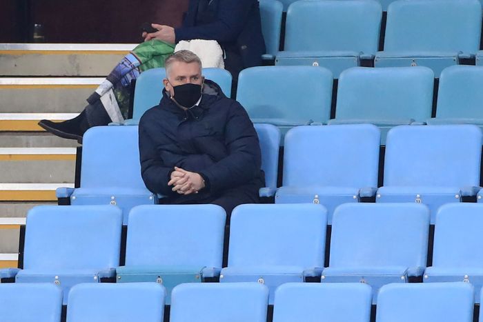 Dean Smith er nok fornøyd på tribunen. Villa-manageren ble utestengt etter at han fikk rødt kort i forrige kamp mot Manchester City.