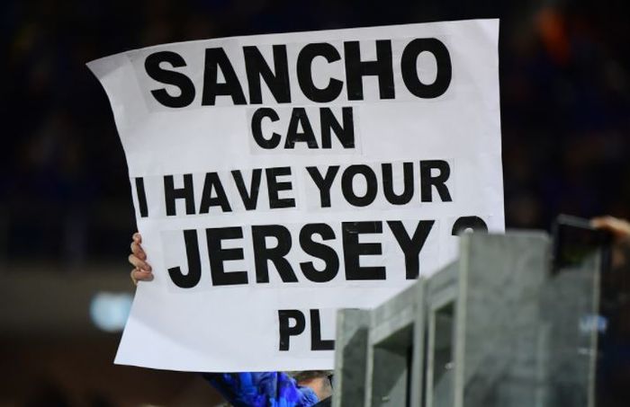 En tilskuer med grei oppfordring til Jadon Sancho. Kan fort bli en ubrukt drakt, Sancho har ikke fått mye spilletid i Manchester United etter overgangen fra Borussia Dortmund.