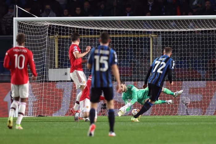 Dette er scoringen til Atalanta. Så kan man lure: Hva er enklest for De Gea, å sette ut en fot og blokkere skuddet eller å kaste seg ned? Hva går raskest hvis du skal reagere?