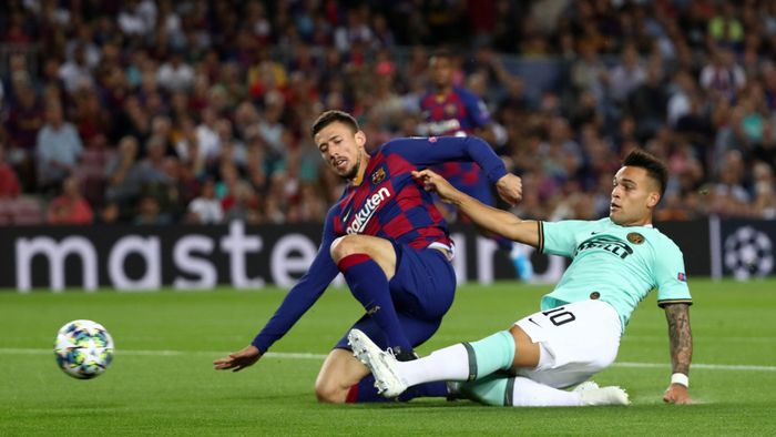 SÅ SITTER DEN FOR INTER! Etter litt klabb og babb på midten, får Alexis Sánchez dyttet ballen frem mot Lautaro Martínez. Spissen setter fart mot Lenglet. Barcelona-stopperen prøver å takle i det Martinez avslutter, men spissen setter inn 1-0 i lengste hjørne bak Ter Stegen.