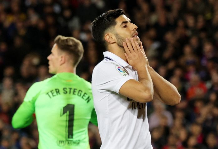 Marco Asensio (Real Madrid) kommer seg fri på Camp Nou, men avslutningen går utenfor.