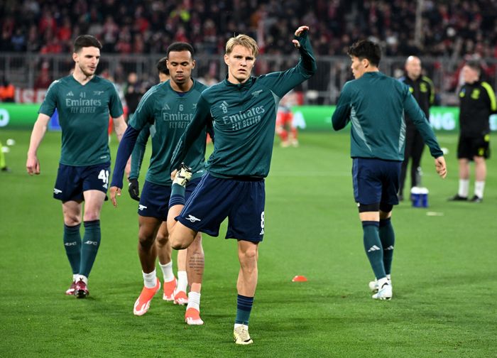 Ødegaard oppgitt over at Bayern får et innkast. Stadig mer i ballkontakt, nordmannen. Holder seg mest langt ut til høyre sammen med Saka.