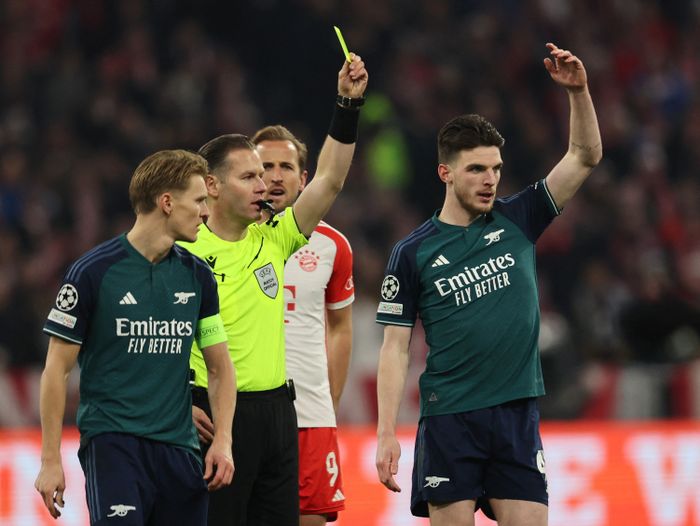Fullt kok. Bayern setter i gang spillet mens Arsenal drikker. Ødegaard rasende. Dommeren stopper spillet. Vi begynner på nytt.